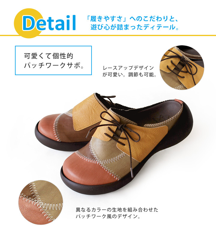 レースアップで甲の調節も可能なさっと履けてラクチンなサボです。